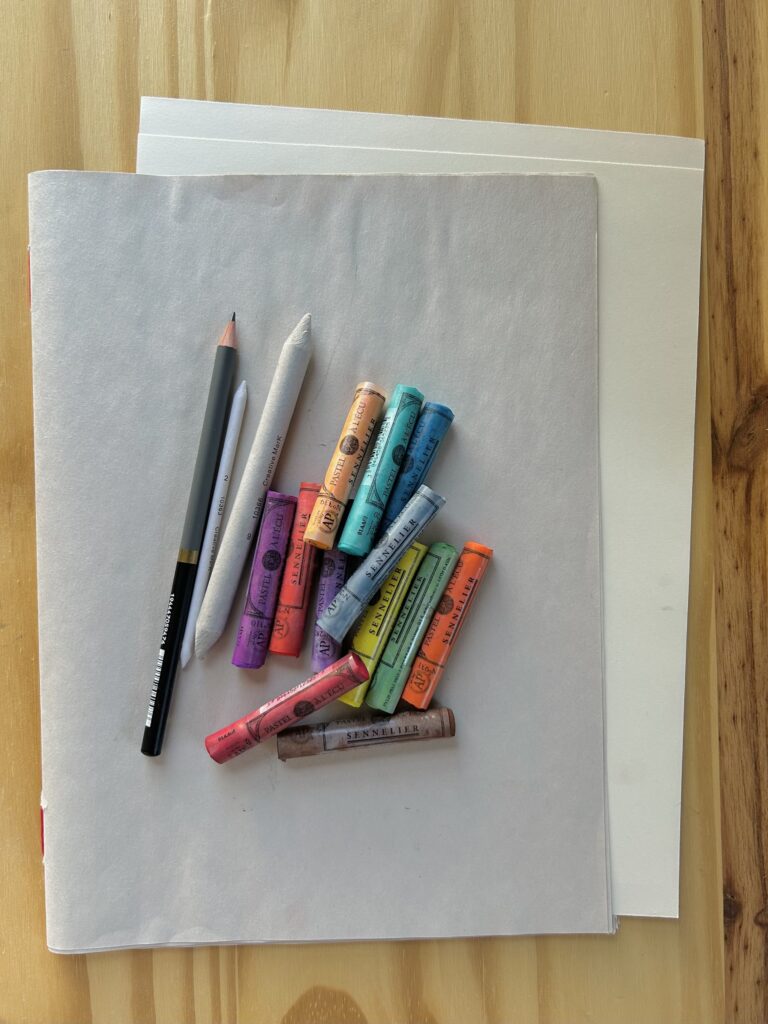 Learn a new medium with a sketch book and two sheets of drawing paper. Select six Sennelier soft pastels for your use in addition to stumps and a napkin for blending.
